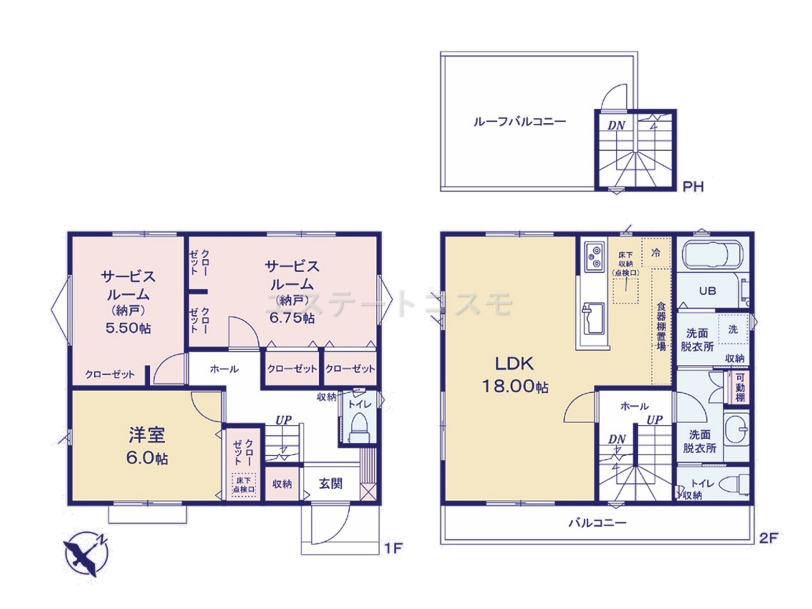 1LDK(+2サービスルーム・ルーフバルコニー) |